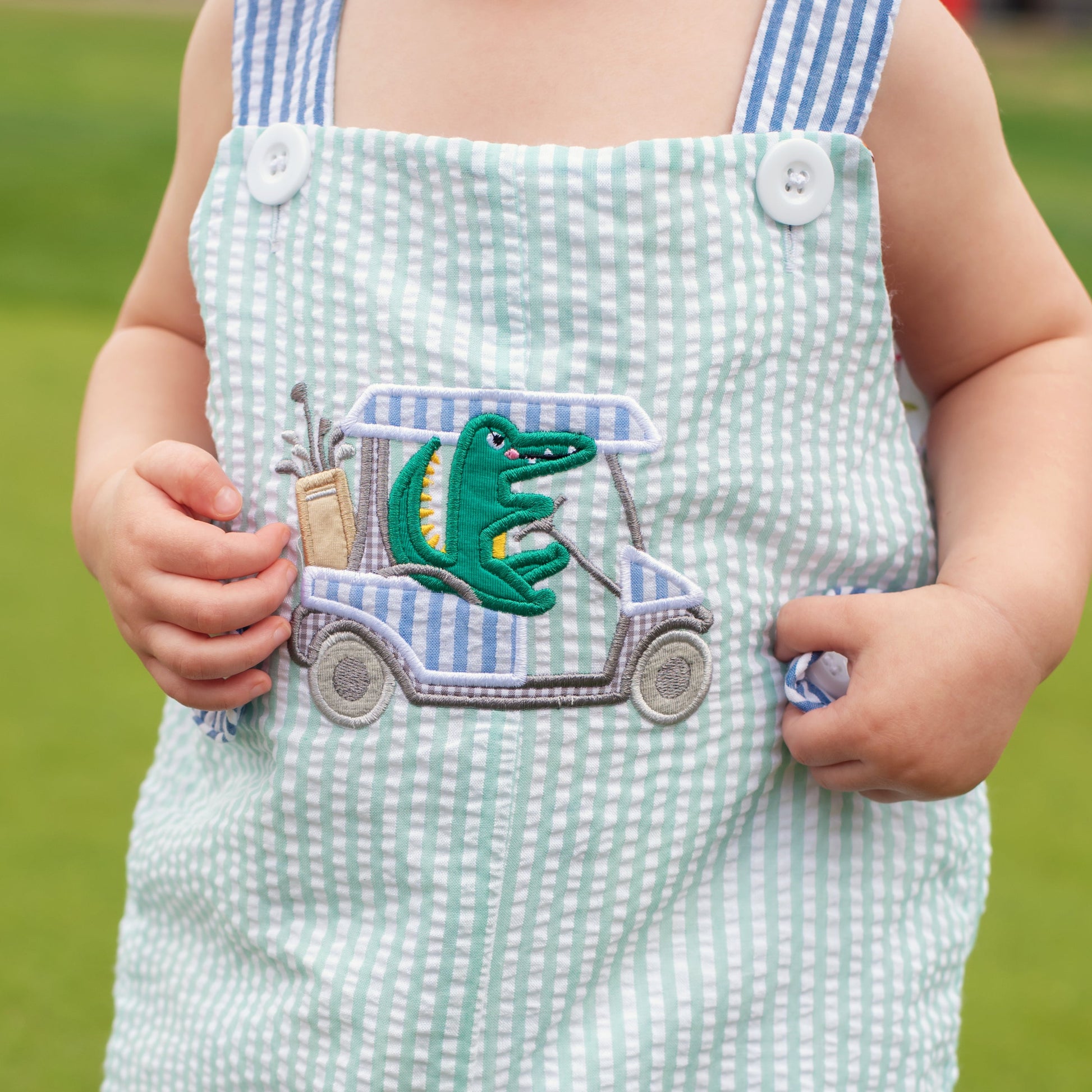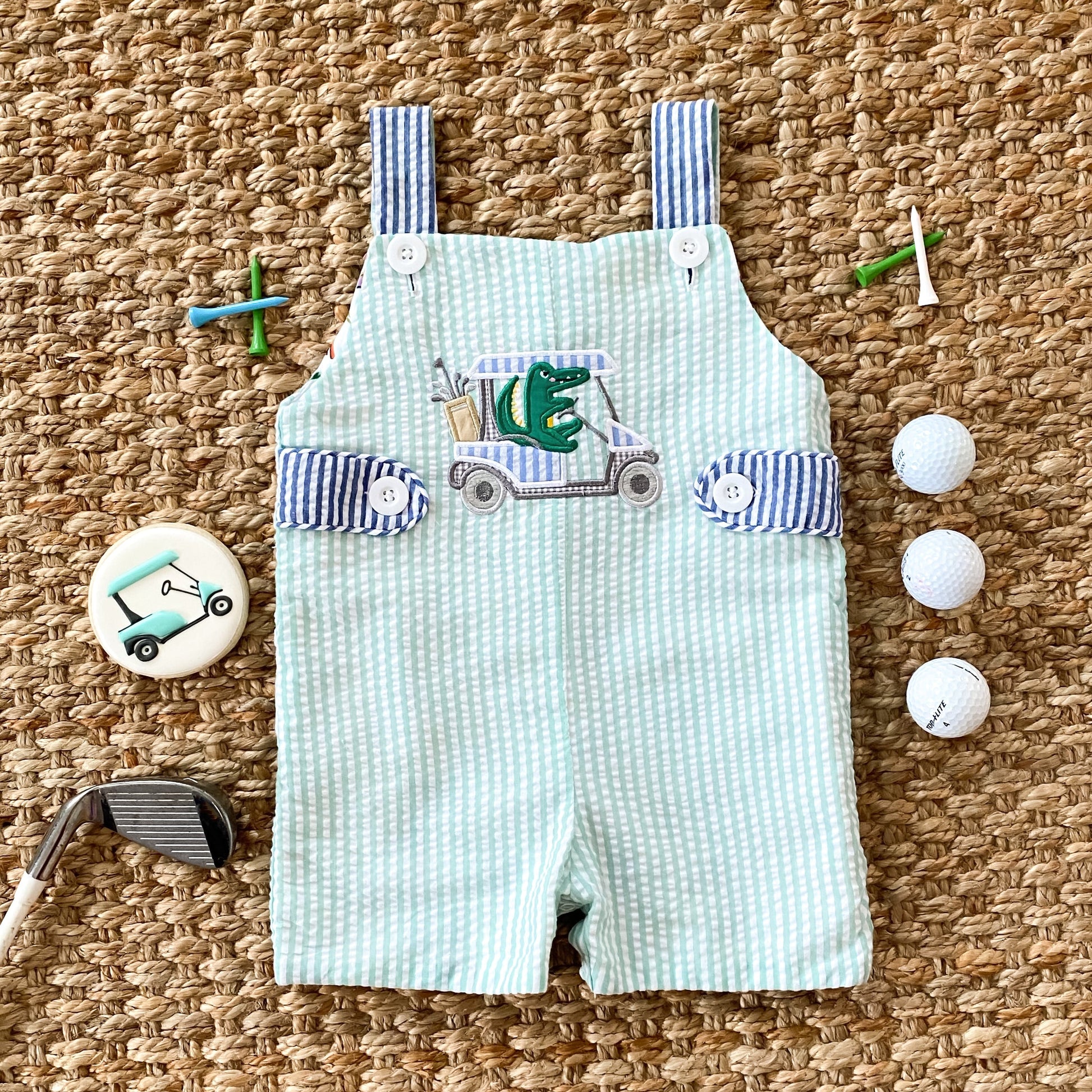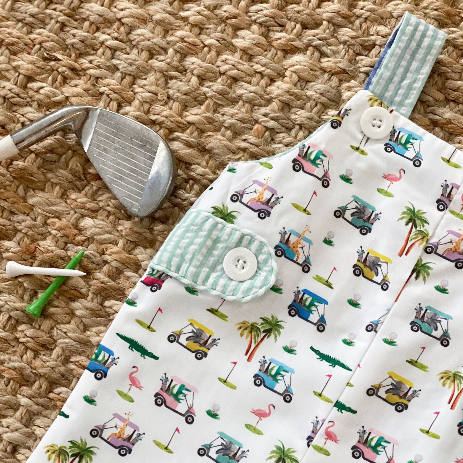 Two outfits in one! The Reversible Palms Golf Jon Jon features a custom, pastel golf print designed by the talented Katherine Herrell Studio. The Jon Jon reverses to an applique alligator driving a golf cart on mint seersucker.